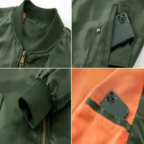 Give your daily outfit a fresh twist with our Carter Basic Unisex Bomber Jackets—timeless style combined with casual coolness. Featuring a signature bright orange lining, these jackets are ideal for layering no matter the season. Whether you're out and about or chilling at home, the roomy unisex fit (oversized on women) pairs effortlessly with all your favorites. Embrace comfort, own the vibe!