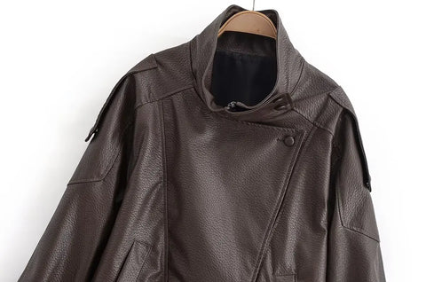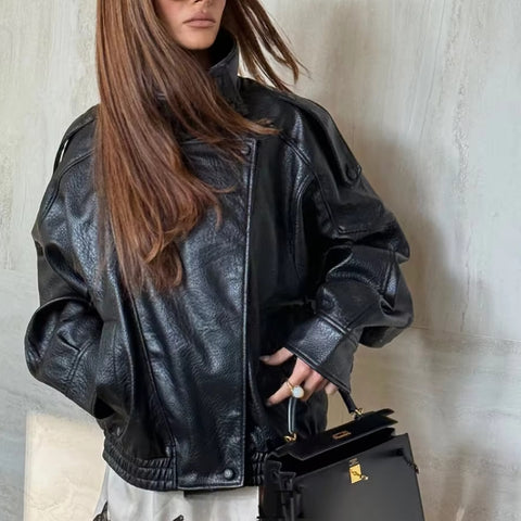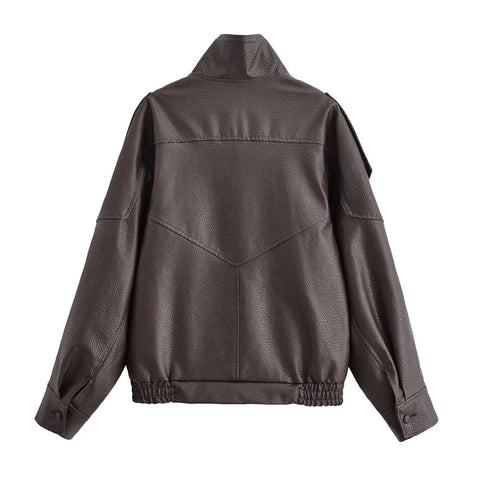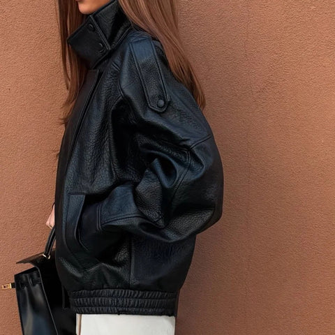Add some edge to your look with the Diane Stand Collar Faux Leather Bomber Jacket. This playful jacket combines the cool vibe of faux leather with a stand collar for a fresh twist on a classic style. Perfect for layering, it brings attitude and fun to any outfit while keeping you comfortable and confident.