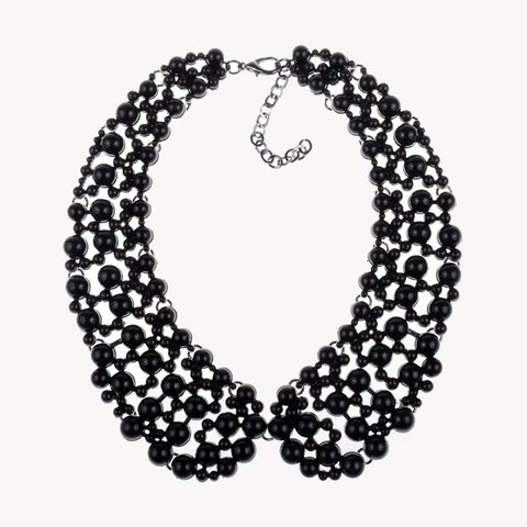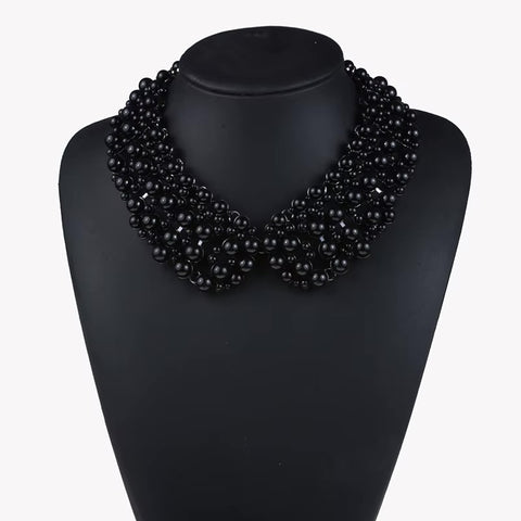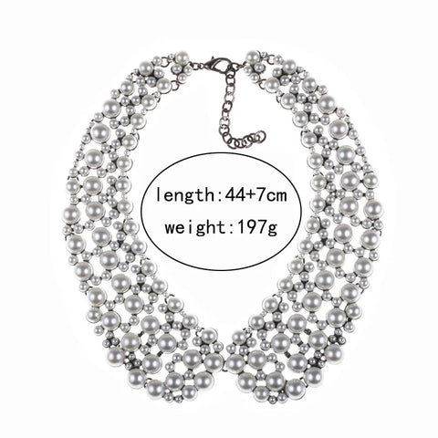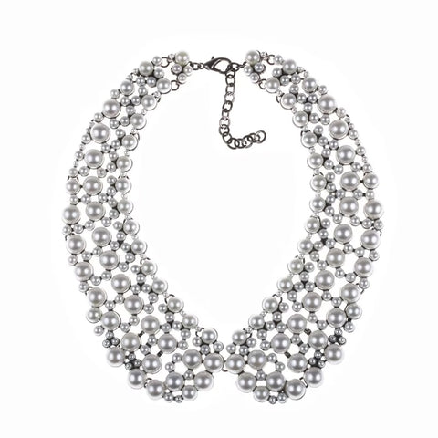 Layered bib-style silhouette with faux pearls and faceted crystal accents