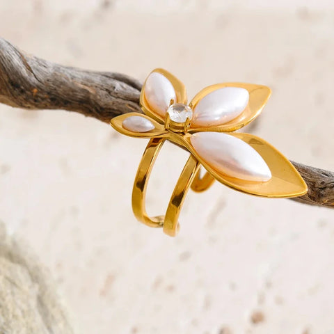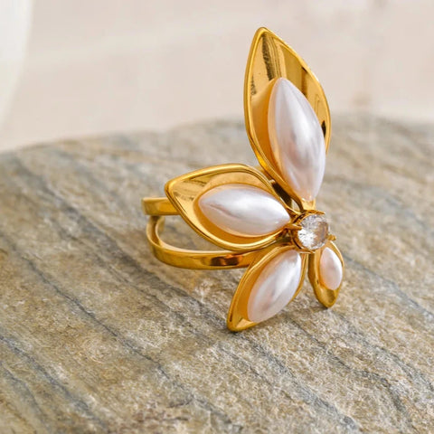 Elevate your everyday elegance with this stunning Evangelina Open Pearl Bloom Ring, a sculptural and dramatic butterfly like flower bloom design crafted with luminous imitation pearls and gold-plated stainless steel. Its wrap-open band creates an airy, floating petal silhouette — soft, feminine, and effortlessly eye-catching.