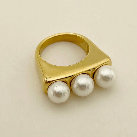 The Lillies Ring brings a refined French-inspired elegance to your everyday style. Designed with a sculptural squared band and topped with three luminous faux pearls, it blends modern geometry with timeless femininity. The polished gold-tone finish adds a luxurious touch, making it an effortless statement piece for both casual and elevated looks.