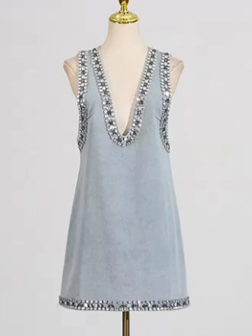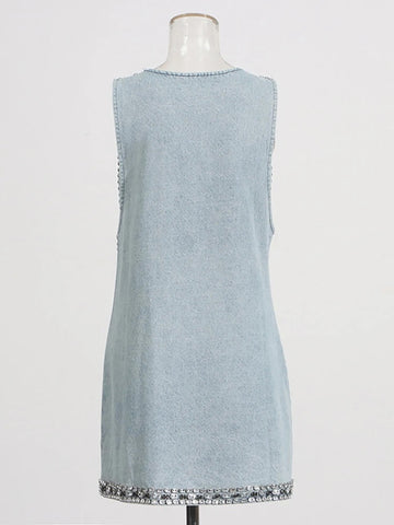 Get ready to make an unforgettable impression in the Aria Crystal Trim Plunge Neck Mini Denim Dress! Adorned with stunning crystal trim and featuring a sultry plunge neckline, this dress will add a touch of glamour to your wardrobe. Whether for a night out or a special occasion, every fashion-forward individual will want this must-have mini denim dress for effortless style. Layer over trousers or a skirt for a chic and versatile look!