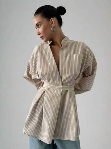 Step up your style with the Clara Pinstripe Belted Long Tunic Shirt, a playful twist on classic sophistication. Its subtle pinstripe pattern pairs perfectly with a cinched belt, creating a flattering silhouette that’s as fun as it is chic. Perfect for layering or wearing solo, this tunic adds a dash of flair to your everyday wardrobe. Whether you're heading to brunch or a casual meeting, it’s your go-to piece for effortless charm and comfort.