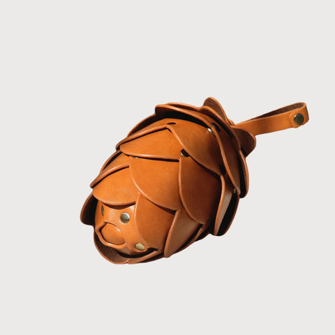 The Calla Pinecone Wrist Clutch Bag is designed to echo the shape of a pinecone, with a 3D sculpted body made from individually cut pieces joined together by light brushed gold-tone rivets. The layered construction creates a dimensional, pinecone-like silhouette that feels both unique and luxurious.