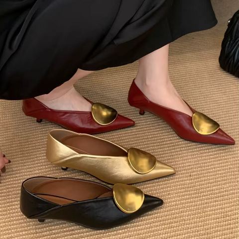 Chic and sculptural, the Luna Soft Leather Flats are where comfort meets artful design. Crafted from buttery-soft faux leather, these pointed-toe flats feature a bold, gold-tone disc accent that catches the light with every step. The deep-cut vamp elongates the foot, adding a refined, modern silhouette that transitions effortlessly from day to evening.