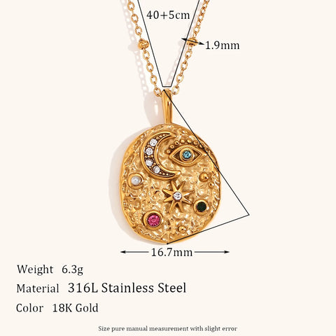 The CZ Star Moon Texture Disk Pendant Necklace offers a delicate blend of celestial charm and refined design. Featuring a textured disk adorned with shimmering cubic zirconia stars and moons, this necklace adds a subtle sparkle to your ensemble. Perfectly balanced for everyday wear or special occasions, its elegant craftsmanship lends a sophisticated touch to any outfit.