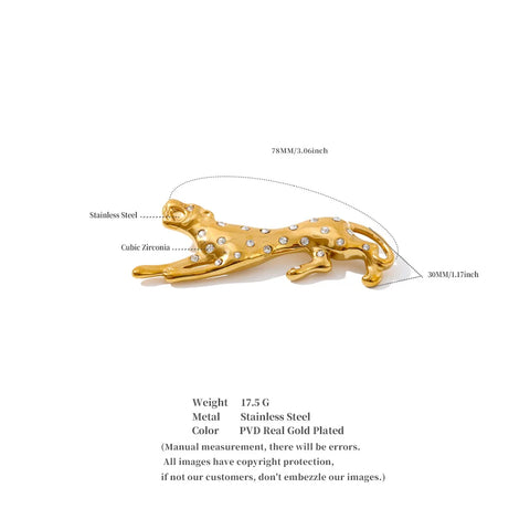 Unleash your wild side with the Celeste Gold Leopard Crystal Brooch, a stunning statement piece that embodies strength and sophistication. Crafted in polished gold-tone metal, this sleek leopard stretches in mid-stride, its body adorned with sparkling crystal accents that catch the light from every angle.