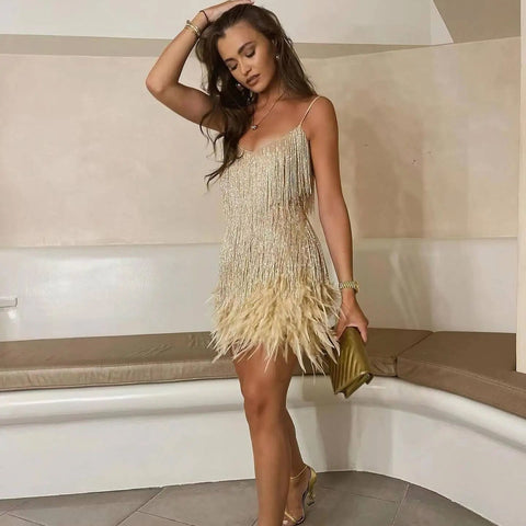 Get ready to party and turn heads with the Teressa Feather Tassel Sequin Mini Dress! This stunning flapper-style dress is guaranteed to make you stand out in any crowd. With its feathers, tassels, and sequins, you'll be the life of the party. It's time to let loose and have some fun!
