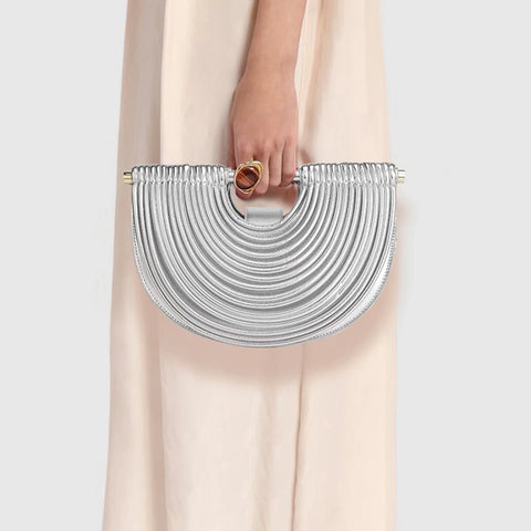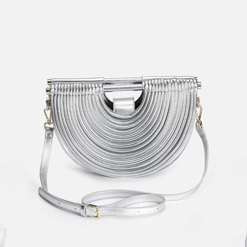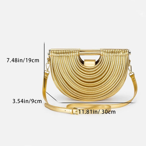 Turn heads with the Pamela, a statement shoulder bag designed in a bold sculpted crescent shape and finished in radiant metallic gold. Its circular structured, ripple-textured silhouette and adjustable strap make it a true fusion of art and function. Whether worn as a crossbody or handheld, the Pamela is your go-to piece for adding architectural elegance to any outfit.