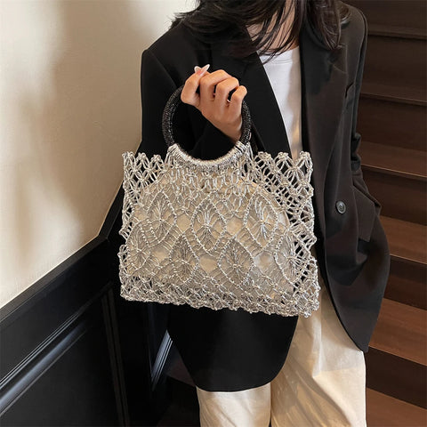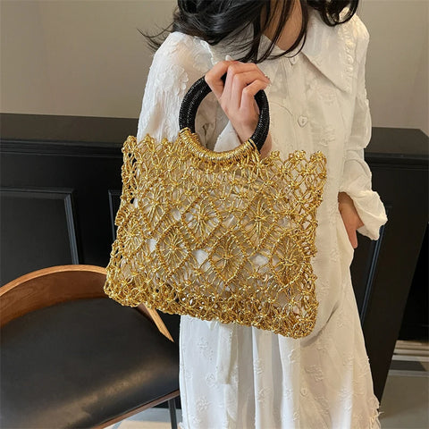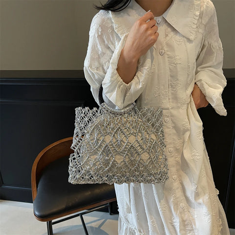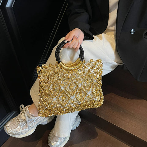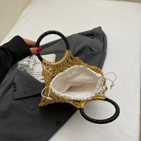 Bring sparkle to your outfit with the Sofia Metallic Woven Ring Handle Bag. Its shimmering woven texture and unique ring handle add a fun, eye-catching detail to any look. Compact yet stylish, it’s perfect for carrying your essentials with a dash of playful glam wherever you go. Comes with inner pouch.