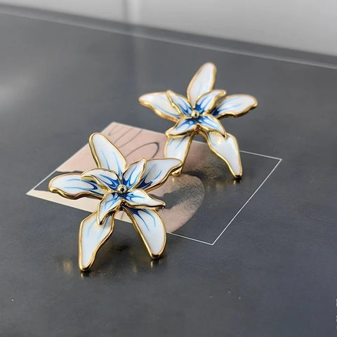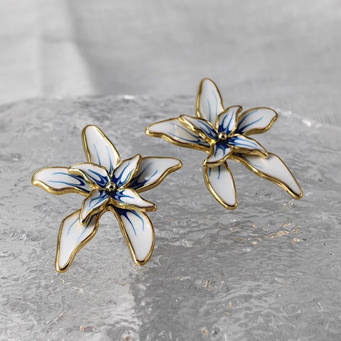 Lysandra captures the quiet elegance of a blooming flower, rendered in sculpted metal with soft enamel-style detailing. Each petal is outlined in warm gold tones and filled with painterly white and blue accents, creating a refined yet artistic finish. Lightweight and expressive, these stud earrings bring a touch of modern romance to everyday looks while remaining polished enough for evening wear.