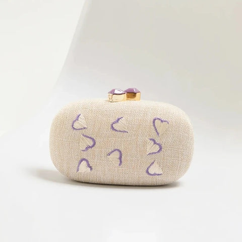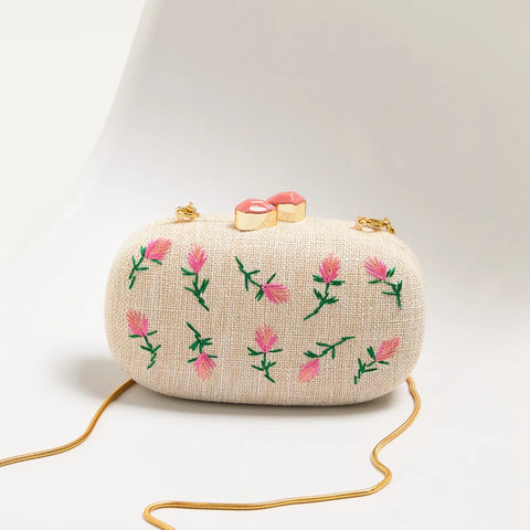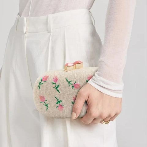 Delicate and quietly poetic, the Miyako Floral Clutch blends soft structure with handcrafted charm. Made from textured linen-look fabric and detailed with subtle floral embroidery, this piece feels timeless yet modern. The compact silhouette fits comfortably in hand, while the sculpted metal clasp adds a refined finishing touch. Perfect for weddings, garden parties, and intimate evenings, Miyako is the kind of accessory that completes an outfit without overpowering it.