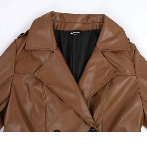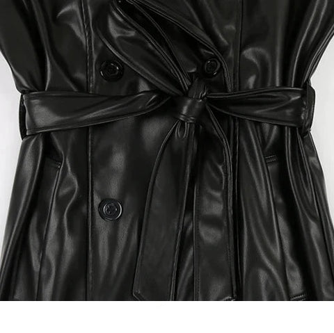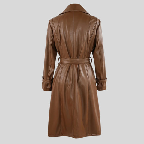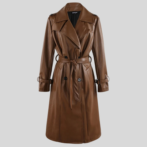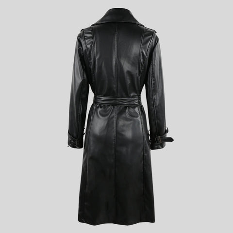 Command attention in The Nova Trench — a sleek reinvention of a timeless icon. Crafted from supple faux leather with a soft satin-like finish, this statement coat defines modern sophistication. The classic double-breasted silhouette, wide lapels, and adjustable waist belt create a sculpted, confident look that transitions effortlessly from day to night.
