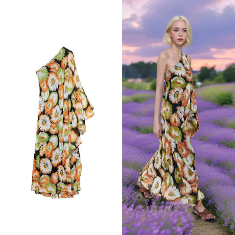 Infuse your closet with a lighthearted spirit thanks to the Lorena Floral One Shoulder Boho Maxi Dress. Featuring a lively floral pattern and a charming one-shoulder cut, it’s ideal for bright days and impromptu escapades with a boho flair. The flowing material and easy fit ensure comfort while making a stylish statement wherever you wander. Let your playful nature shine in this effortlessly chic maxi dress.