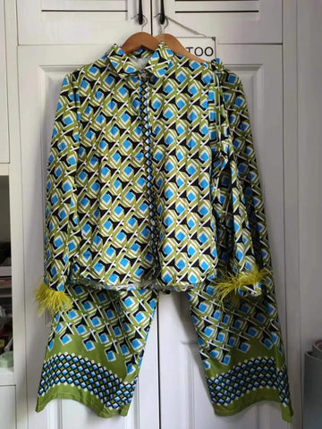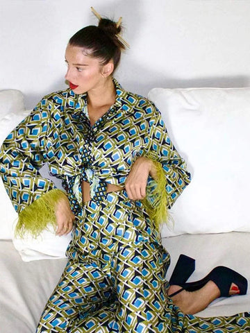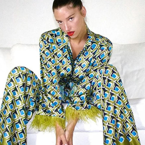 šŸ’š Miro Feather-Trim Printed Satin Pajama Set – Retro Luxe Comfort