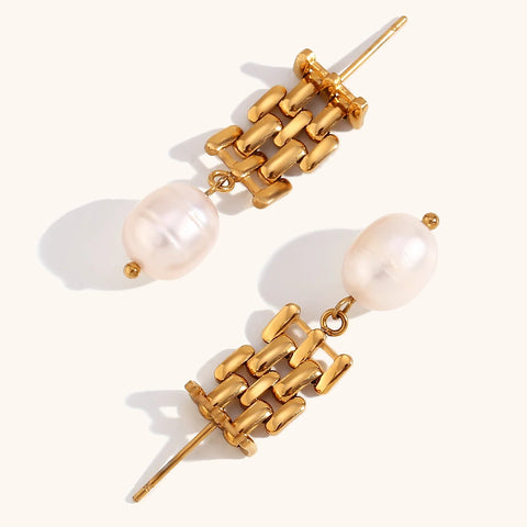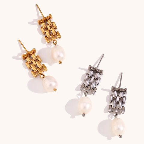 The Clara Link & Pearl Drop Earrings perfectly blend modern edge with classic elegance. Featuring a bold, chain-link design inspired by industrial artistry, each earring is finished with a luminous natural pearl that adds a touch of softness and sophistication.