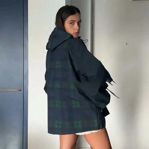 Make a statement with the Emilee Plaid Oversized Jumper Jacket—your new go-to for effortless cool. This navy-green plaid stunner boasts a relaxed, roomy silhouette with dramatic wide sleeves and a crisp stand collar that demands attention.