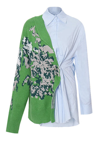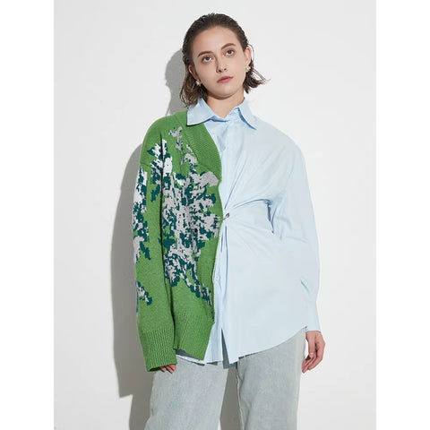 Meet Jordana — a striking asymmetric hybrid top that blends a crisp light-blue poplin shirt with a textured jacquard-knit panel for a bold, modern artwear look. Half tailored shirt, half cozy knit, this piece creates an effortlessly sculptural silhouette.