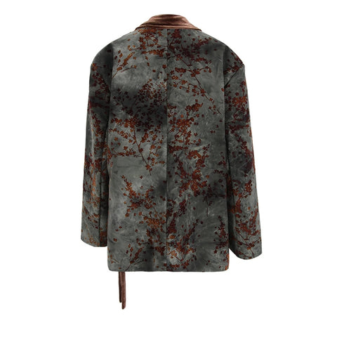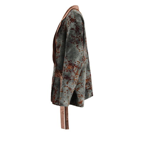 Elevate your wardrobe with the Josie Kimono Floral Velvet Blazer. This stunning blazer features an elegant floral pattern and a refined kimono-inspired silhouette in luxurious velvet. Its rich texture and graceful design offer a sophisticated touch, perfect for adding timeless charm to both formal and evening ensembles. One of kind piece to own.