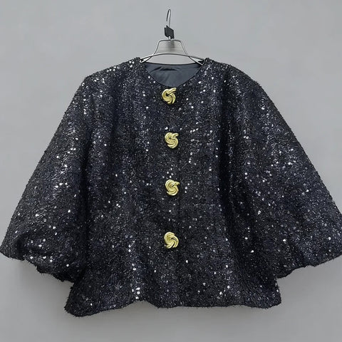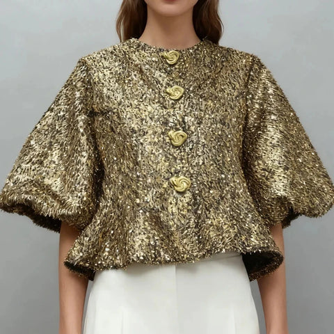 The Natasha jacket brings high-impact glamour with a couture twist. Designed with an all-over sequin finish, this cropped silhouette features dramatic puff sleeves, a softly flared hem, and signature sculptural gold swirl buttons. Elegant yet bold, it’s the perfect statement layer for evenings, events, and holiday styling.