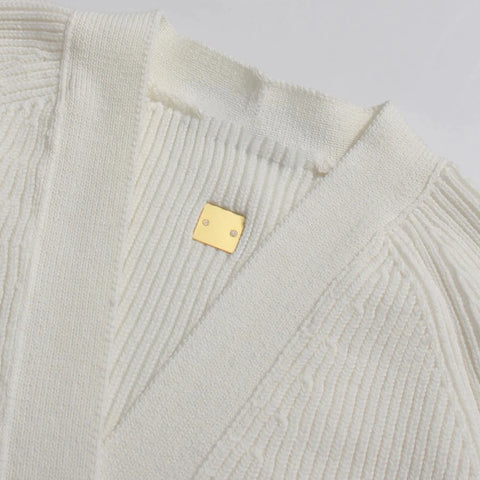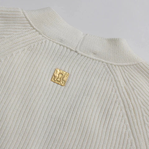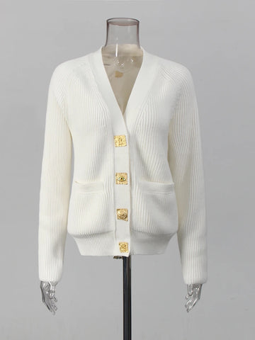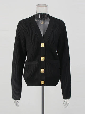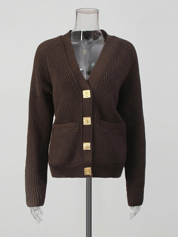 Playful meets polished in this mid-weight knit cardigan. Golden square buttons with charming details add personality, while the sculpted V-neckline, relaxed sleeves, and cinched waist create an effortlessly chic silhouette. Perfect for layering year-round. Elevate everyday style to a new golden.