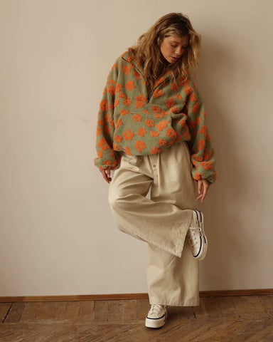 Cozy up in the Jillian Retro Floral Sherpa Pullover Jumper! This soft and snuggly sherpa fleece features a fun retro floral print that adds a splash of vintage charm to your chill days. Perfect for staying warm while keeping your style bright and playful—it's like wearing a hug with a pop of personality!