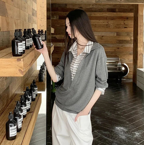 Meet Maggie, the top that does the styling for you. This clever patchwork design combines a soft grey knit wrap-style sweater with a striped button-down shirt panel for an instantly polished, layered look — without the bulk. Relaxed yet refined, Maggie drapes beautifully with its slouchy-fit knit and crisp shirt collar + cuffs peeking through for contrast. Pair her with wide-leg trousers, denim, or skirts for a clean, modern everyday outfit that looks intentionally styled.