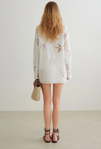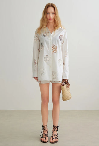 A breezy oversized cotton shirt with delicate eyelet cut-out seaside motif embroidery for an airy, sun-kissed look. Maja blends effortless elegance with everyday comfort, perfect for warm-weather styling, beach days, vacations, and relaxed weekends.