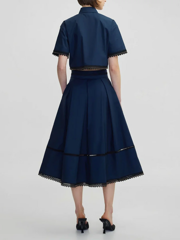 Turn heads in this playful two piece dress set! The cropped princess cotton top adds a touch of retro elegance while the A-line flare midi skirt brings flirty fun. Finished with beautiful rivet and frill trim, this dress is sure to make a statement. Do I hear Roman Holiday?